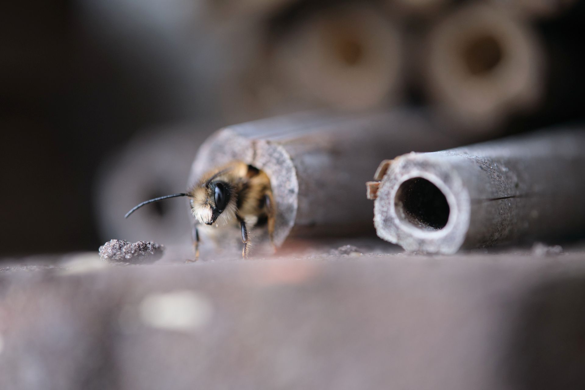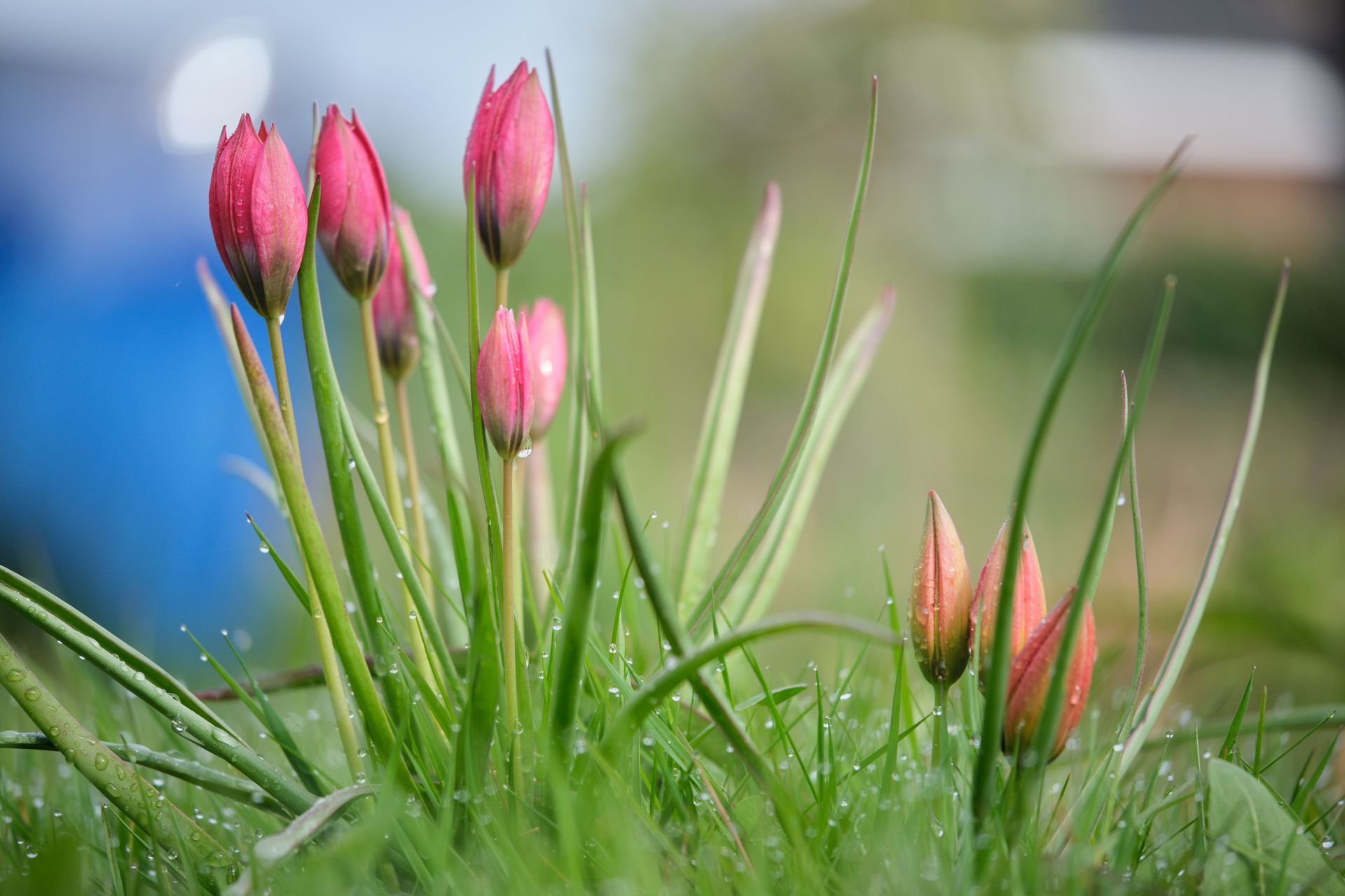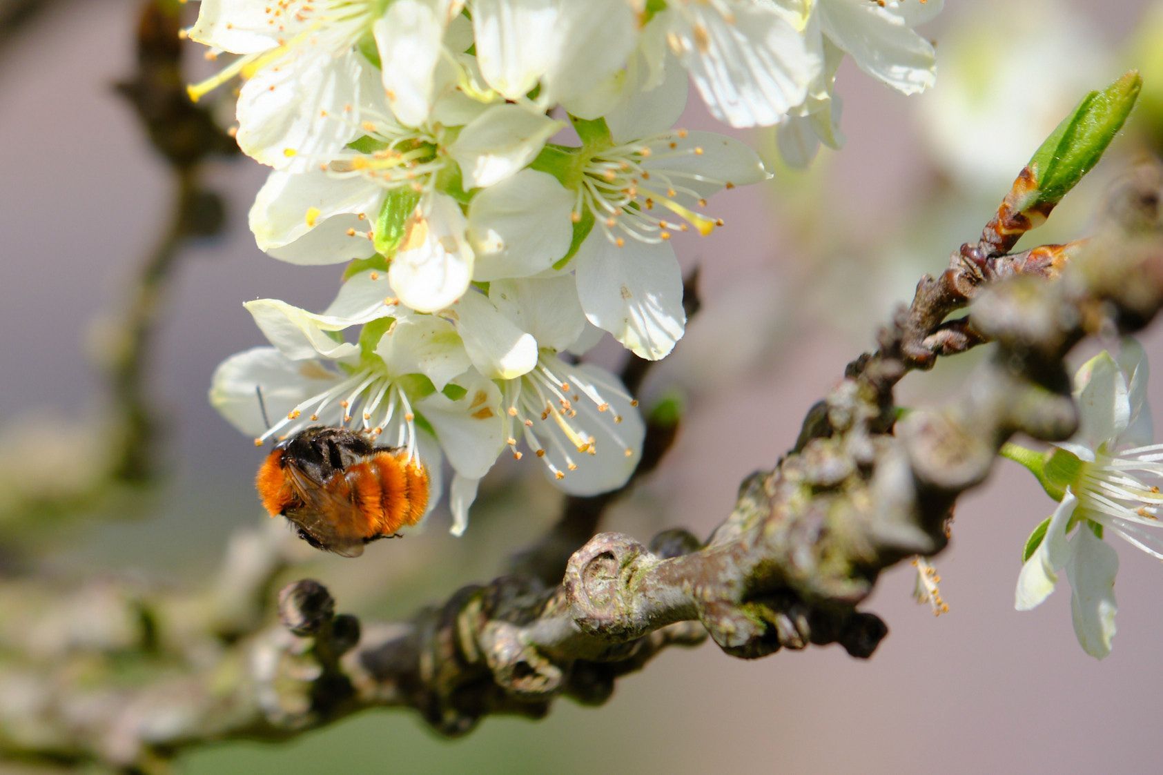 Het is nog niet erg warm en het is een stuk minder zonnig dan vorig jaar, maar de meeste planten en insecten laten zich hier niet door weerhouden. Een vosje drinkt van de pruimenbloesem. De rosse metselbij is al weer eitjes aan het leggen en moet oppassen dat de spin haar niet pakt. Als de zon doorbreekt na een regenbui glinsteren de regendruppels in het gras en op de tulpen. Klik op de foto's als je ze groter wilt zien.
