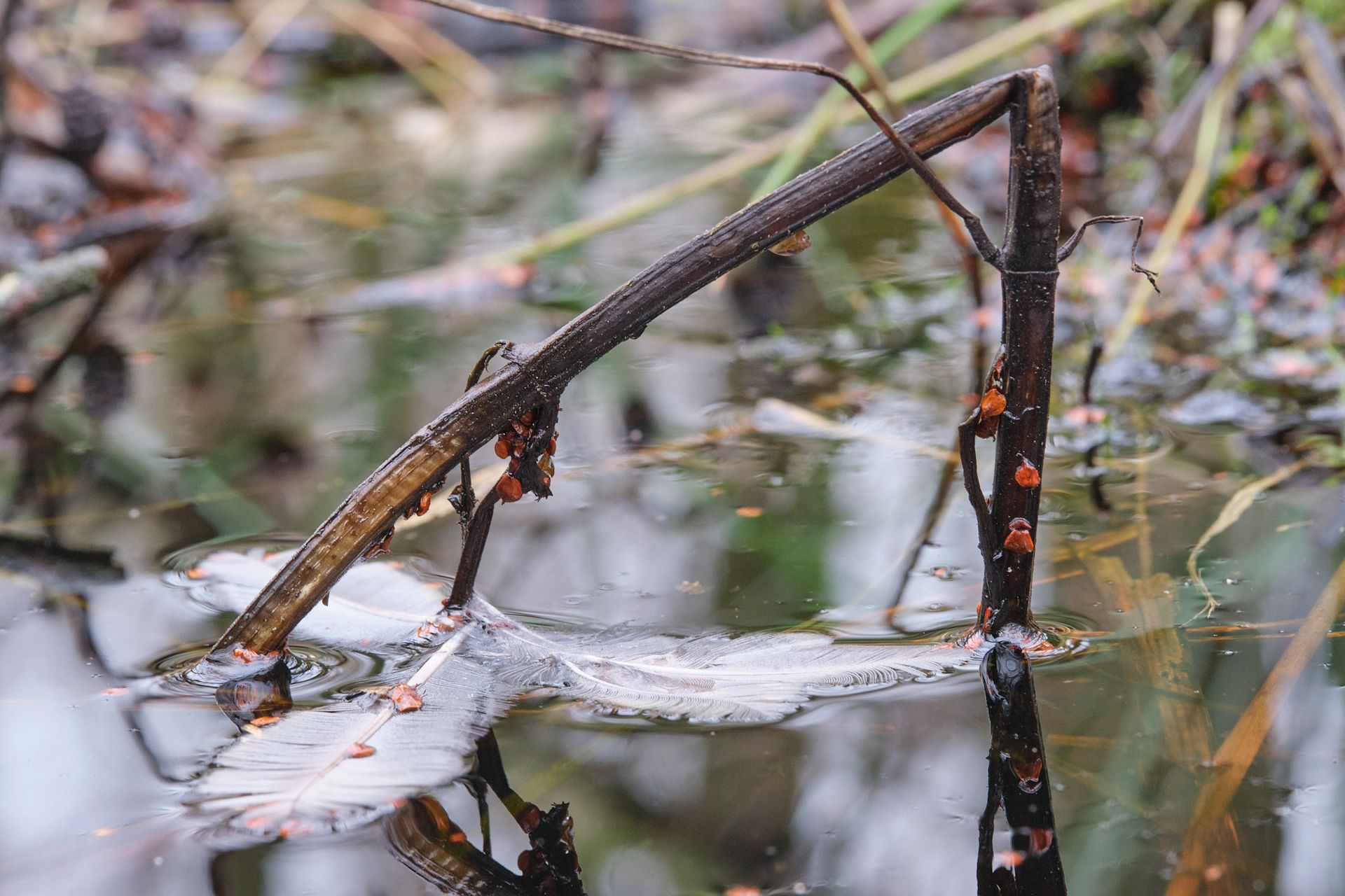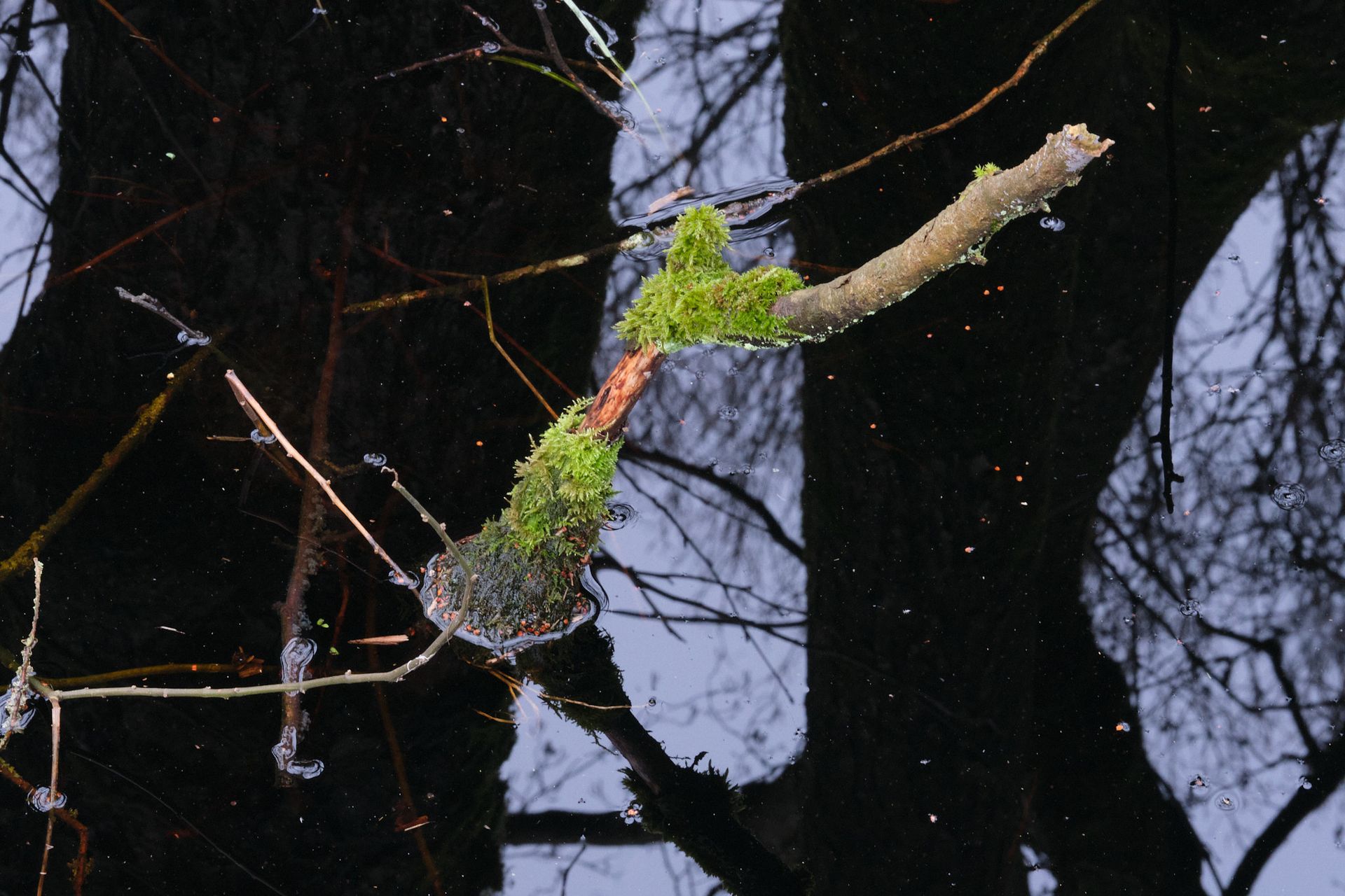 Op de foto's hieronder (tik of klik er op om ze in groter formaat te bekijken) zie je onder ander boomschors, waterdrieblad dat net boven water komt, een tonderzwam, een roodporie houtzwam, een judasoor, een paaltje, een tak in het water, een geknakte stengel met veren en sneeuwklokjes.