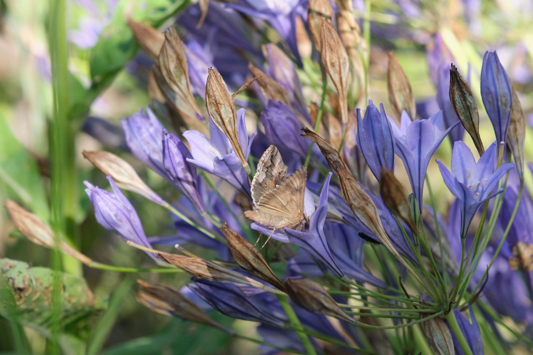 Deel 1 van een serie zomerfoto's. Achtereenvolgens: brodiaea in het gras na een regenbui, kleine watersalamander op de rand van de vijver, klein geaderd witje op verbena, gamma uiltjes op verbena, bessenband zweefvlieg op hemerocallis, sint jansvlinder op een drumstick, de kop van een plakker rups en een pompoen. Op de grote foto de bloemen van een crocosmia. Klik op een foto om ze te helemaal te zien.