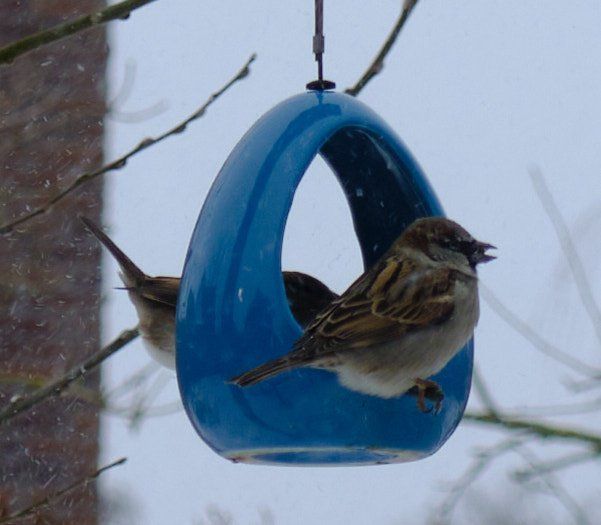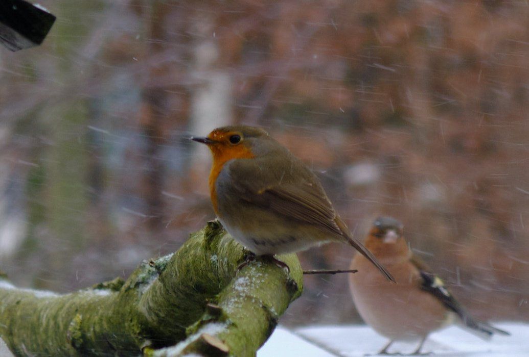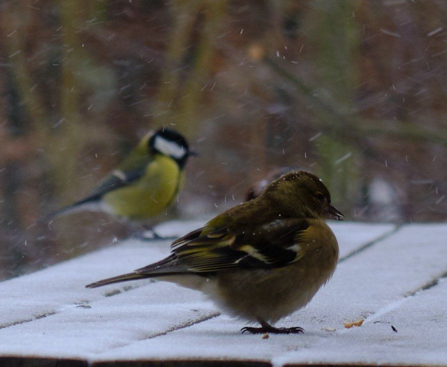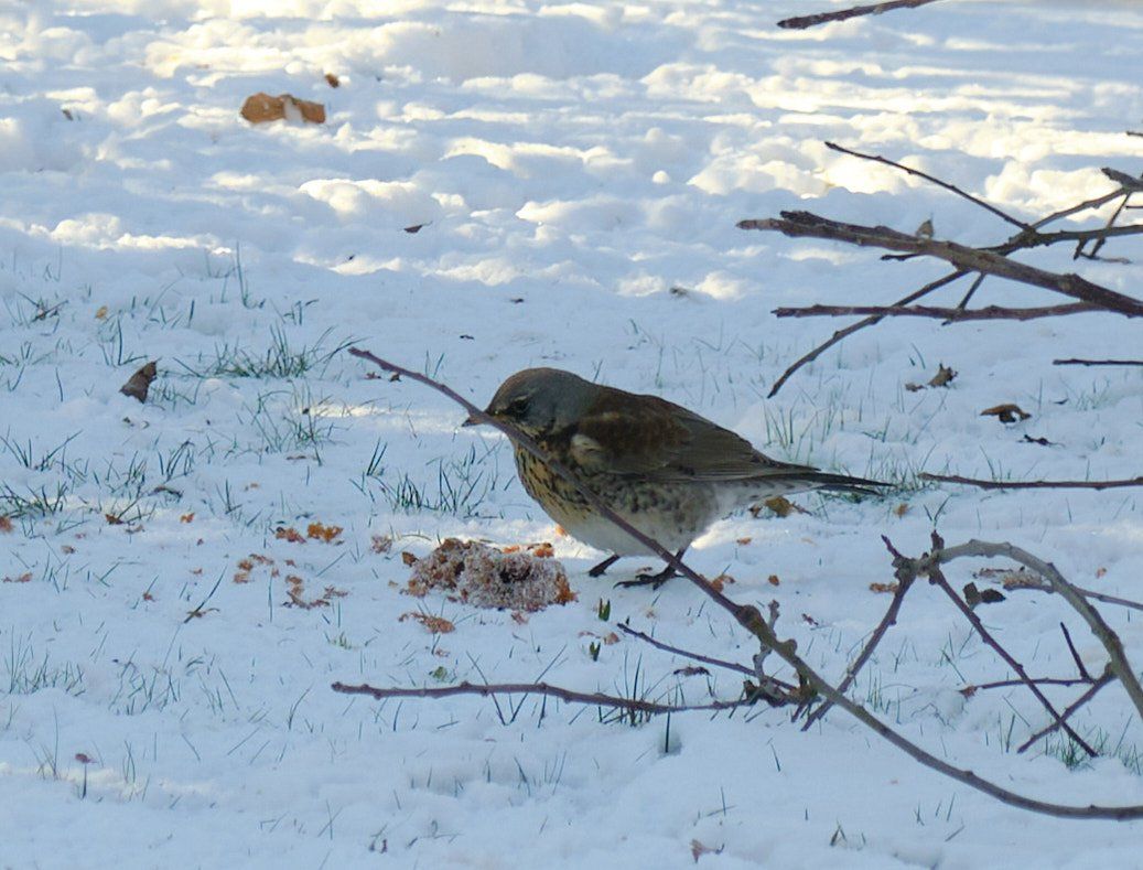 Tijdens de winterse week kwamen er veel vogels eten bij de voederplekken in de tuin. Ze kwamen ook toen het stormde en sneeuwde. Nu zijn er altijd wel veel vogels in onze tuin, omdat er altijd wel iets te halen valt. Kramsvogels en koperwieken (helaas niet op de foto) zien we alleen in de winter.