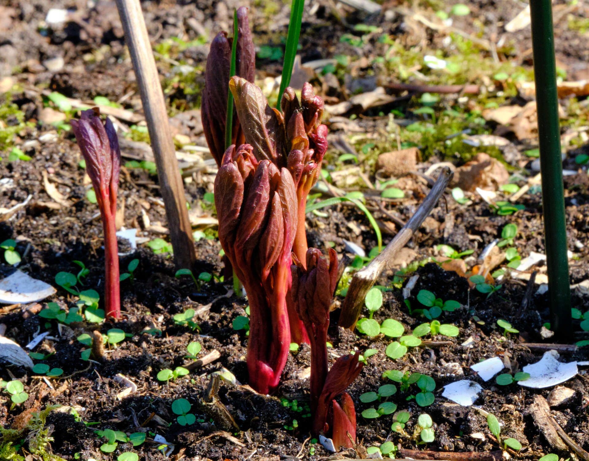 Eindelijk is het wat warmer. De pruim heeft zijn eerste bloemen open en de pioenroos schiet nu ook de grond uit. Vanmiddag ook de aardappelen gepoot. Geen foto, maar dat komt wel als ze opkomen.