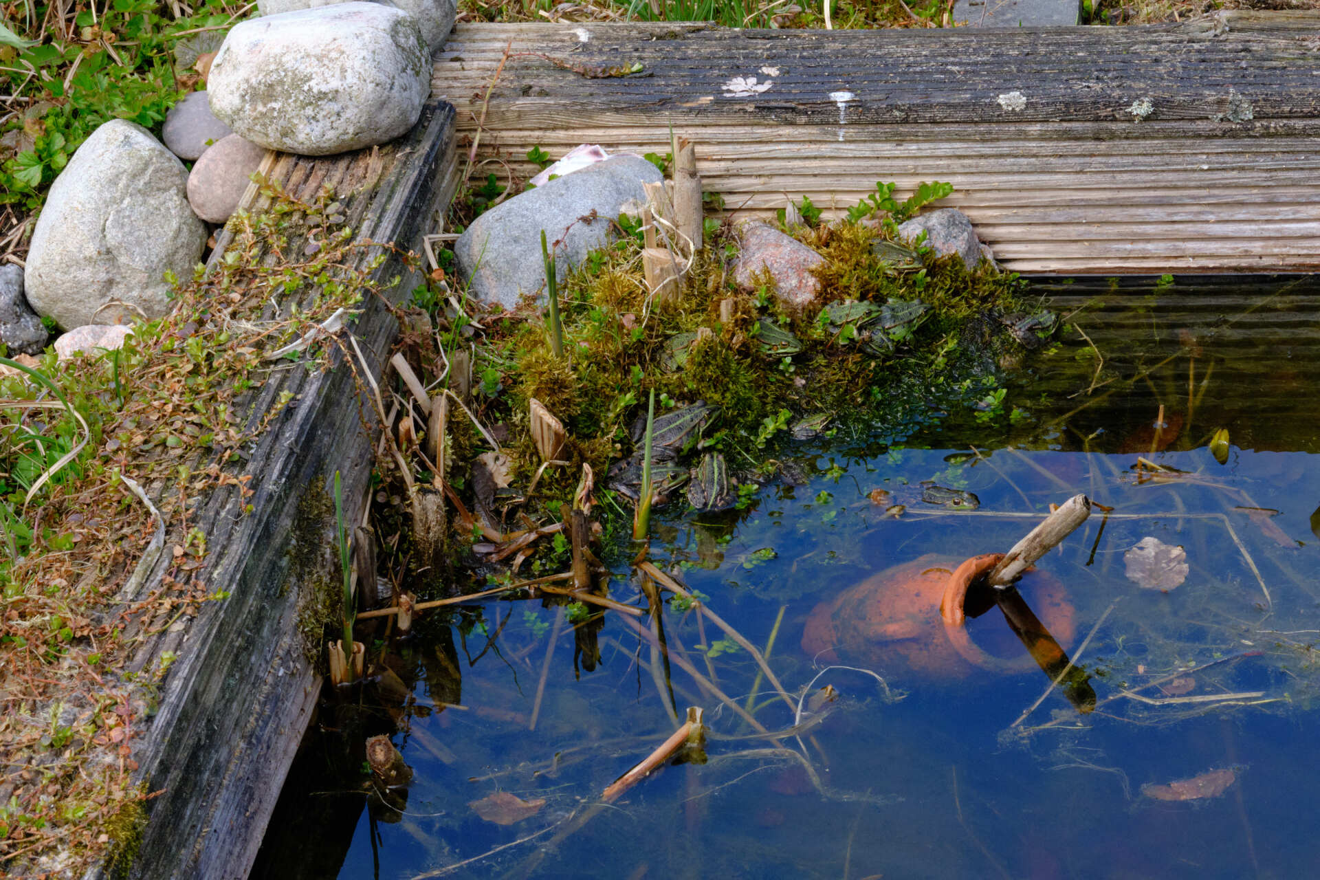 Deze week zijn de rosse metselbijen uitgekomen. De mannetjes hangen voor het insectenhotel om de vrouwtjes die uitkomen direct te kunnen bevruchten. De kikkers lagen met zijn allen in de zon. Helaas is er later van de week een reiger langs geweest en lijkt het erop dat ze allemaal verdwenen zijn. Of zou dat komen omdat de temperatuur weer gedaald is?