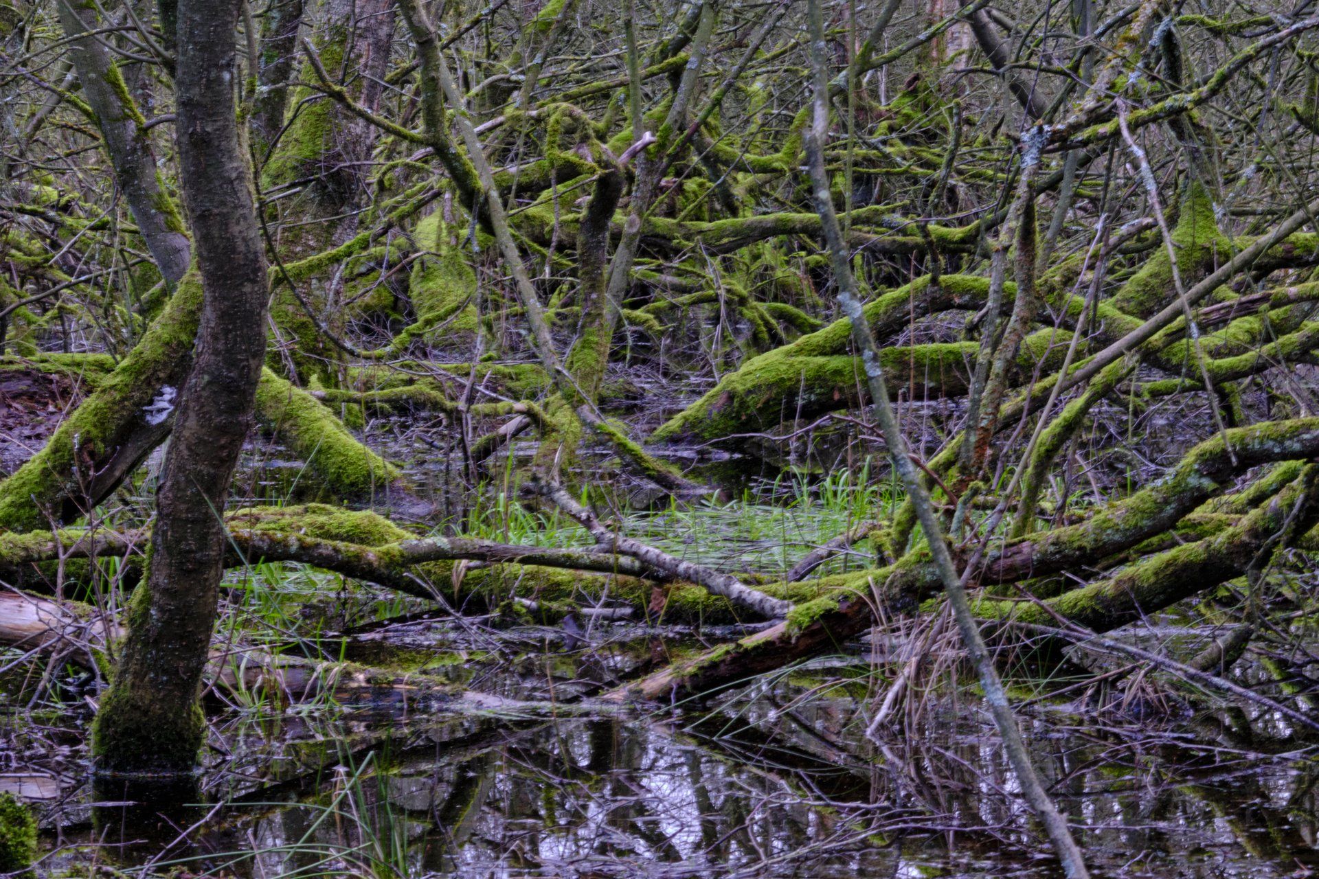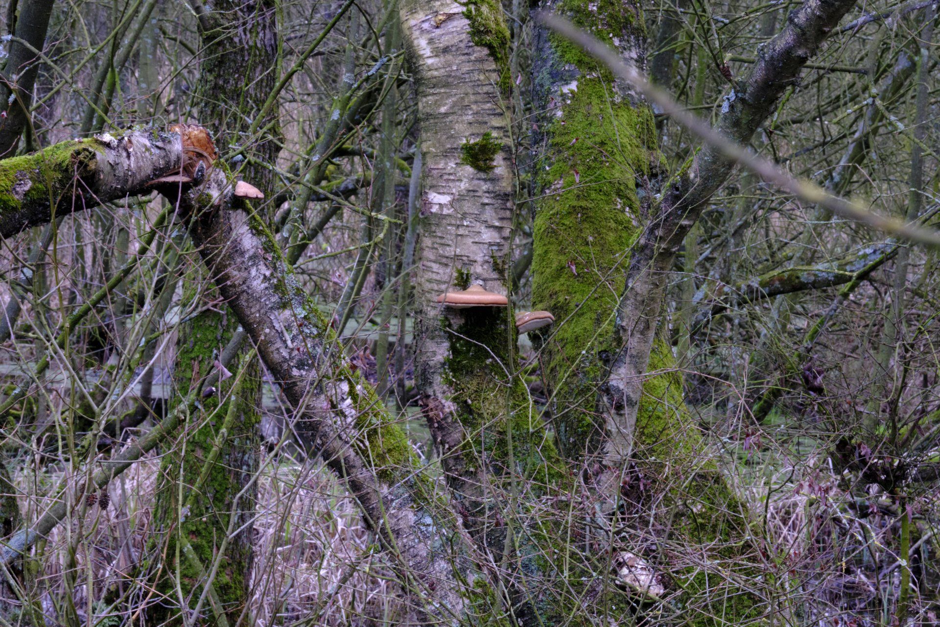 Vanochtend maar weer eens een rondje Lettelberter Petten gelopen. Het blijft een mooi gebied ook als het weer eens niet zo mooi is. De grijze buisjeszwam (grote foto) blijkt veel meer dan alleen grijs. Er groeien geweizwammen, korstmossen combineren prachtig met klimplanten en de elzen en berken die met hun voeten in het water staan geven de sfeer goed weer.