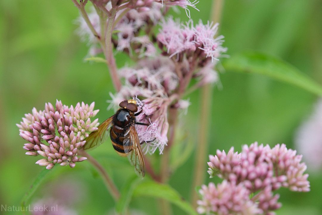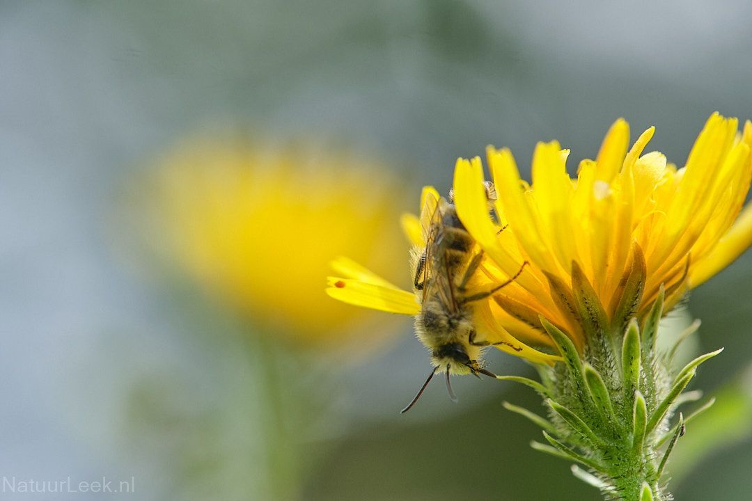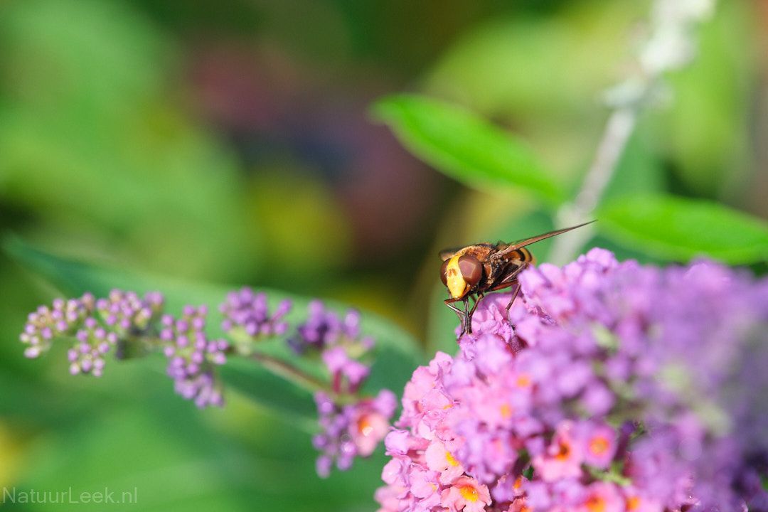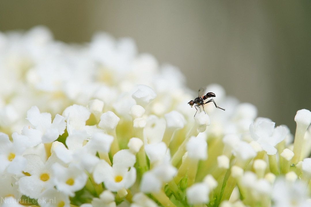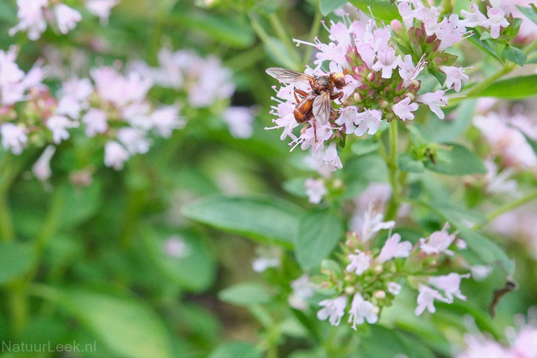 Hierboven een metallic vlieg op rood opschijnend blad. Verder nog: een pluimvoetbij, een roestbruine kromlijf, zaadbol van biggenkruid, een stadsreus, de rups van een spanner, een sepsis spec. (een heel klein vliegbeestje), een vroege glazenmaker, nog een stadsreus, een gewone slobkousbij en een penseelkever.