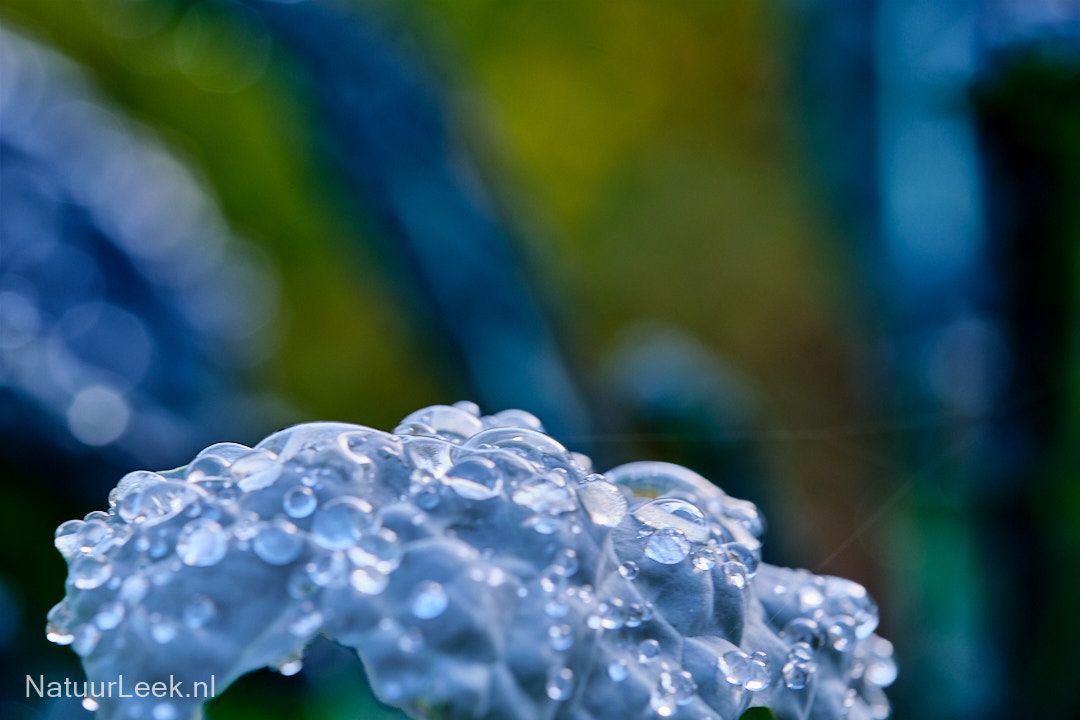 We hebben inmiddels de eerste vorst en sneeuw gehad. Berijpte en natte palmkool is dan altijd leuk om op de foto te zetten (foto 2 en 3). Drupjes in een web zijn ook fotogeniek (foto 4).
